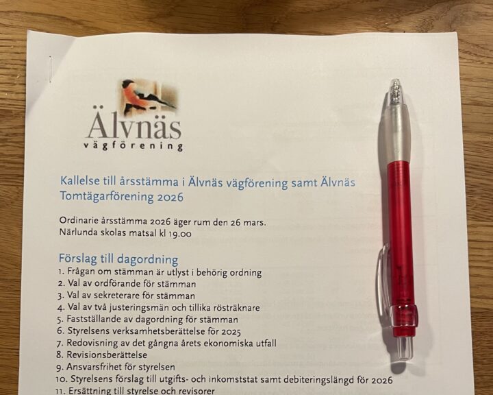 Styrelsens uppgift är att förvalta föreningens vägnät och tillhörande markområden samt tillgodose medlemmarnas behov av ett rimligt vägnät. Alla åtgärder bekostar vi själva och vägnätet omfattar ca 6 km väg. Styrelsen håller också kontakt med kommunen i frågor som rör utbyggnad av området. Vissa delar av området i Älvnäs som tillsynes tillhör tomtägarföreningen tillhör egentligen kommunen och förvaltas av vägföreningen / tomtägarföreningen.